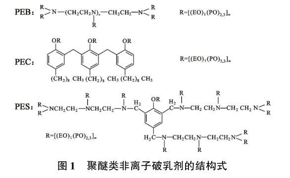 實(shí)驗(yàn)用破乳劑HY01是季銨鹽類陽離子破乳劑,相對分子質(zhì)量約6 000,固含量約35%;其他破乳劑為聚醚類非離子表面活性劑,平均相對分子質(zhì)量均在5 000左右,EO(乙氧基)∶PO(丙氧基)=1∶2.3。3種聚醚類非離子破乳劑的結(jié)構(gòu)式見圖1,其中PEB是支狀聚醚類非離子破乳劑,屬于多乙烯多胺聚氧乙烯聚氧丙烯醚型破乳劑,PEC是梳型聚醚類非離子破乳劑,屬于酚醛樹脂聚氧乙烯聚氧丙烯醚型破乳劑,PES是星型聚醚類非離子破乳劑,屬于酚胺醛樹脂聚氧乙烯聚氧丙烯醚型破乳劑。