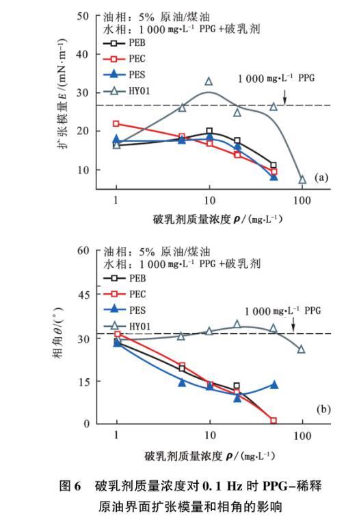 考察了固定破乳劑質(zhì)量濃度為10 mg/L時(shí),不同質(zhì)量濃度PPG-稀釋原油界面膜的擴(kuò)張流變性質(zhì),結(jié)果見(jiàn)圖8??梢钥闯觯瑢?duì)于不同質(zhì)量濃度的PPG界面膜,10 mg/L的3種非離子破乳劑均能大幅度降低擴(kuò)張模量,有效地破壞界面膜強(qiáng)度,星型聚合物PES對(duì)于高質(zhì)量濃度的PPG界面膜效果更佳,這與PES超強(qiáng)的頂替能力有關(guān)。對(duì)于反相破乳劑HY01,當(dāng)PPG質(zhì)量濃度較低時(shí),由于無(wú)法形成亞層結(jié)構(gòu),HY01對(duì)模量具有一定的降低效果,當(dāng)PPG質(zhì)量濃度較高時(shí),對(duì)于高模量、高強(qiáng)度的界面膜,HY01分子與PPG分子形成的界面亞層反而對(duì)模量和膜強(qiáng)度具有增效作用。PPG質(zhì)量濃度的影響趨勢(shì)也可以通過(guò)圖7所示的機(jī)制加以解釋。