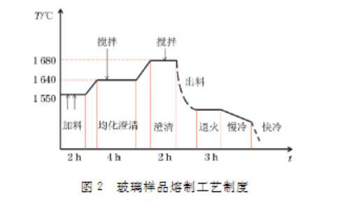 實(shí)驗(yàn)樣品的熔制流程如圖2所示,首先根據(jù)組分設(shè)計(jì)計(jì)算玻璃配方,稱量并配制約500g配合料,在研缽內(nèi)充分研磨、混合均勻,待硅鉬棒電爐升溫至1550 ℃時(shí),將混合均勻的配合料分多次加入預(yù)熱過的鉑金坩堝中,保溫2h至原料熔化充分后以5 ℃/min的升溫速率加熱至1640 ℃,并在該溫度條件下保溫4h,實(shí)現(xiàn)玻璃的充分熔化與澄清。然后繼續(xù)升溫至1680 ℃保溫2h使玻璃液完全澄清,出料前30 min進(jìn)行攪拌,然后將玻璃液澆筑在預(yù)熱的耐熱鋼模內(nèi),成型后轉(zhuǎn)入780 ℃的馬弗爐內(nèi)進(jìn)行退火處理,保溫3h后再以1 ℃/min降溫速率慢冷至300 ℃,隨爐冷卻得到經(jīng)過退火的玻璃樣塊。