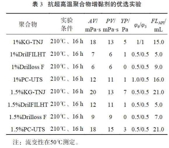 室內(nèi)對(duì)4種高溫聚合物增黏劑材料進(jìn)行了單劑抗溫性能對(duì)比評(píng)價(jià)。其中KG-TNJ為溫敏疏水締和聚合物提黏劑,DrilFILHT為納米片狀氧化鎂酚醛樹脂改性聚合物增黏降濾失劑材料,Drilloss F為納米微球聚合物復(fù)合增黏聚合物材料,PC-UTS為某國(guó)外代表性高溫聚合物材料。評(píng)價(jià)配方:基礎(chǔ)配方+2.5%KG-UTSTA+聚合物,實(shí)驗(yàn)結(jié)果見表3。