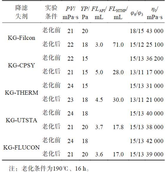 為避免超高溫下材料間的相互影響干擾判斷,室內(nèi)在190℃下先固定KG-TNJ作為增黏劑材料不變,對(duì)5種改性淀粉類高溫降濾失劑材料進(jìn)行了初選。其中,KG-Filcon為海上常用抗高溫改性淀粉;KG-CPSY和KG-THERM均為聚合物接枝改性抗高溫淀粉;KG-UTSTA和KG-FLUCON均為室內(nèi)使用2-丙烯酰胺基-2-甲基丙磺酸AMPS、聚苯乙烯乳液與可溶性淀粉在堿性條件下通過接枝共聚生成抗超高溫改性淀粉,2者區(qū)別在于KG-UTSTA為機(jī)械攪拌條件下共聚合成,KG-FLUCON為超聲波機(jī)械協(xié)同方式混勻后再進(jìn)行合成。評(píng)價(jià)配方:基礎(chǔ)配方+1.0%KG-TNJ+2.5%降濾失劑,實(shí)驗(yàn)結(jié)果見表2。由表2可知,190℃老化后,各體系的流變性能穩(wěn)定,KG-UTSTA和KG-FLUCON體系的高溫高壓降濾失性最好,濾失量小于20 mL,KG-CPSY和KG-THERM體系的高溫高壓降濾失性能次之。分析原因?yàn)楦男缘矸鄱家肓丝垢邷亟又簿蹎误w,但是KG-FLUCON、KG-UTSTA除了引入AMPS類抗高溫單體外,還引入聚苯乙烯乳液,增加了接枝改性的抗高溫基團(tuán)和空間結(jié)構(gòu),通過聚苯乙烯乳液組分的吸附、滲透、覆蓋包裹特性增強(qiáng)了對(duì)淀粉結(jié)構(gòu)的高溫保護(hù)作用和產(chǎn)物的成膜封堵性能,改善了其抗高溫性和濾失造壁。