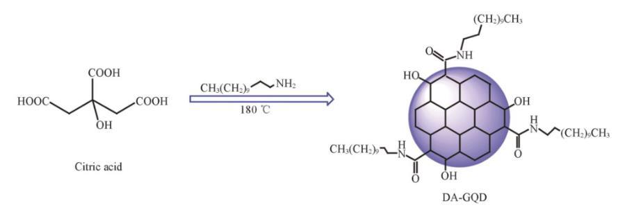 首先采用“自上而下”法,由CX-72炭黑在濃硝酸中回流24 h制備GQD。雖然能夠?qū)崿F(xiàn)一步同時制備單層和多層GQD,但是存在反應(yīng)時間長、強(qiáng)酸會對環(huán)境造成一定污染等弊端。本實(shí)驗設(shè)計通過“自下而上”法,以檸檬酸為前驅(qū)體、直鏈烷基胺為功能化試劑,通過一步熱裂解制備雙親性DA-GQD(見圖1)。檸檬酸分子之間脫水縮合形成六邊形sp2碳原子鍵合的石墨烯片,十二胺通過氨基與檸檬酸上的羧基縮合,將烷基鏈引入石墨烯片的邊緣以提高疏水性。