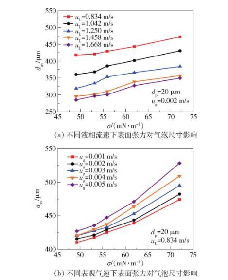 在表觀氣速ug=0.1-0.3 m/s范圍內(nèi),表面張力對(duì)氣泡尺寸的調(diào)控作用呈現(xiàn)非線性特征。當(dāng)ug>0.2 m/s時(shí),高表觀氣速引發(fā)的慣性力(Fg=πd2ρgug/4)增強(qiáng),部分抵消了低σ?guī)淼某叽鐪p小效應(yīng)。實(shí)驗(yàn)數(shù)據(jù)顯示,在ug=0.3 m/s條件下,σ從72降至49 mN/m僅使dav減少18%,較ug=0.1 m/s時(shí)的32%減幅顯著降低。
