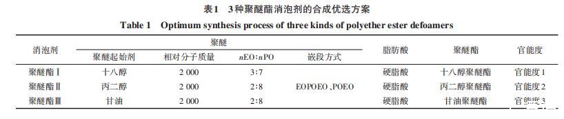 表1 3種聚醚酯消泡劑的合成優(yōu)選方案