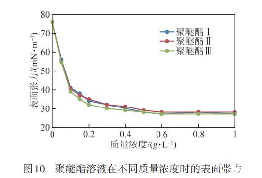 在室溫下,將聚醚酯配制成不同質(zhì)量濃度的水溶液,測(cè)試其表面張力,結(jié)果見圖10。由圖10可知,聚醚酯溶液的表面張力隨其質(zhì)量濃度的增高而下降,當(dāng)聚醚酯溶液的質(zhì)量濃度為0~0.2 g/L時(shí),聚醚酯溶液的表面張力下降較快,當(dāng)聚醚酯溶液的質(zhì)量濃度大于0.2 g/L時(shí),聚醚酯溶液的表面張力隨其質(zhì)量濃度的增加而下降較慢,3種官能度聚醚酯的表面張力下降趨勢(shì)基本一致,當(dāng)聚醚酯溶液的質(zhì)量濃度提高到0.6 g/L時(shí),3種聚醚酯溶液的表面張力均降至27.0 mN/m,說明聚醚酯在較低的質(zhì)量濃度下可以快速降低表面張力,表面性能優(yōu)異。