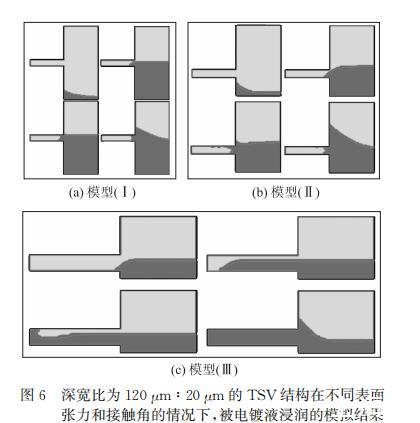 模型(I)使用的表面張力和接觸角為不含活性劑的TSV標準鍍液的實際測量值,仿真結(jié)果是不能完全浸潤;模型(II)采用的是在1L TSV標準鍍液中加入20mL活性劑溶液的實際測量值,這兩種模型在仿真中均表現(xiàn)為不能完全浸潤。