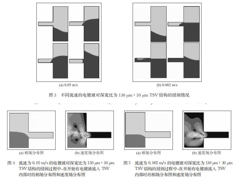 TSV深寬比設(shè)置為130μm:30μm,電鍍液流人速度為0.05 m/s和0.002 m/s的浸潤仿真結(jié)果分別如圖3所示,前者在TSV底部形成氣泡,后者可以完全浸潤。模擬結(jié)果表明降低電鍍液流入速度有利于浸潤。通過仿真中兩種情況下浸潤過程中的流速場對比,可以看出在電鍍液流入的過程中,電鍍液流人速度較大時,如圖4(b)所示,電鍍液表面距離TSV較遠的部分有著相對更大的流速,即電鍍液流過TSV上方的速度大于電鍍液向TSV內(nèi)部流入的速度,導(dǎo)致在電鍍液流過TSV上方時,其流入TSV內(nèi)部的分流量還沒有充滿TSV內(nèi)部排出其中氣體之前,電鍍液就已經(jīng)流過了TSV上方,并將TSV口部封死,導(dǎo)致內(nèi)部殘留氣體無法排出,形成不完全浸潤;而當電鍍液流入速度較小時,如圖5(b)所示,電鍍液表面在TSV口部附近具有相對更大的流速,即電鍍液向TSV內(nèi)部流入的速度大于其流過TSV上方的速度,使得電鍍液流過TSV上方時,有足夠的分流量流入TSV內(nèi)部,將其中氣體排出并將TSV填滿,實現(xiàn)完全的浸潤。