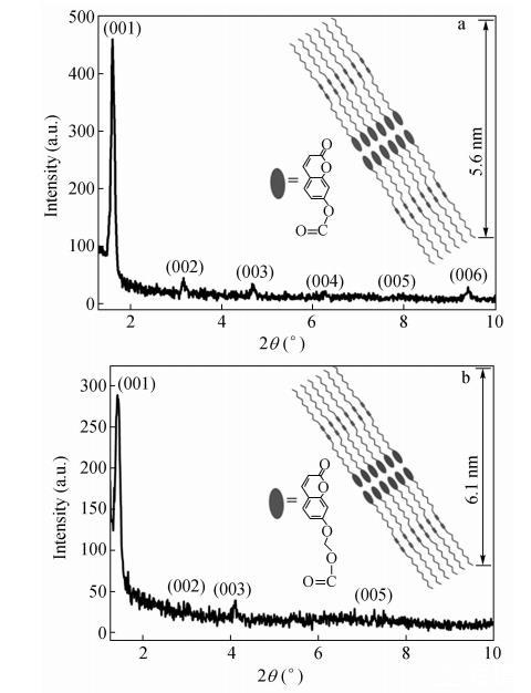 在2θ=2°~10°范圍內(nèi)出現(xiàn)的多個(gè)等距離Bragg衍射峰表明得到的CODA和CO2DA LB膜具有很好的周期性結(jié)構(gòu)。假定從左至右Bragg衍射峰依次為(001),(002),...,(006),用Bragg方程對(duì)各級(jí)衍射峰進(jìn)行計(jì)算可得CODA和CO2DA LB膜層狀結(jié)構(gòu)間距為5.6nm和6.1nm。CO2DA LB膜的Bragg衍射峰較寬,強(qiáng)度較弱,Bragg衍射峰隨角度的增大衰減很快,說(shuō)明CO2DA LB膜中分子排列較CODA LB膜中松散,存在局部的缺陷。理論計(jì)算充分展開(kāi)的CODA和CO2DA分子鏈長(zhǎng)約為3.5nm和3.6nm,所以觀(guān)察到的周期結(jié)構(gòu)包含雙層的CODA和CO2DA分子。我們可以預(yù)想雙層結(jié)構(gòu)的中間區(qū)域是香豆素基團(tuán)經(jīng)過(guò)強(qiáng)烈的π-π堆積作用形成的,而雙層結(jié)構(gòu)單元的外部為烷基側(cè)鏈。香豆素取代二乙炔單體的規(guī)則排列是二乙炔單元進(jìn)行拓?fù)渚酆系南葲Q條件。