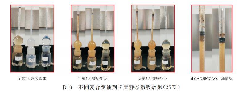 從以上分析來看,降黏增滲型驅(qū)油劑(CCAO和CAO)在靜態(tài)滲吸過程中通過降低原油黏度,提高了巖心原油的流動性及滲吸能力,其中CCAO滿足中黏原油滲吸驅(qū)油要求,靜態(tài)洗油率達(dá)到15.27%,且析出的原油不乳化,在實(shí)際生產(chǎn)過程中無需后續(xù)的破乳處理。