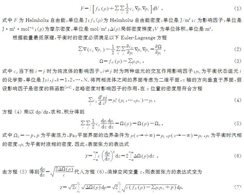 vanderWaals首先提出了密度梯度理論,并將該理論用于氣液界面,通過對氣液界面的研究得出結(jié)論,界面處的密度變化是連續(xù)的,后來該理論被Cahn和Hilliard完善。該理論中,界面的Helmholtz自由能密度為兩部分的加和:均相部分和非均相部分。Helmholtz自由能密度Taylor級數(shù)的二階展開式為