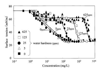 肥皂和礦物成分結合形成不溶性絡合物,因此使用硬水的肥皂溶液的表面張力不穩(wěn)定。 因此,重復進行表面張力測量,以獲得圖7中的表面張力曲線。 當存在硬度組分時,皂的表面張力曲線分四個階段變化。 最初,隨著皂液濃度的增加,皂液的表面張力略有下降。 在第二階段,表面張力值保持不變。 在第三階段,隨著肥皂濃度的增加,表面張力再次降低,直到cmc,在最后階段,表面張力再次趨于恒定。 在第一和第二階段,在透明液體中觀察到肥皂浮渣。 在第三階段,也觀察到肥皂浮渣,但透明液體變?yōu)榉稚⒁后w。 在最后階段,肥皂浮渣消失,觀察到分散液體。