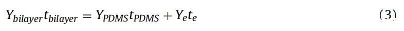測量裸PDMS膜的楊氏模量后,將單層電極轉(zhuǎn)移到這些PDMS膜上。使用與裸PDMS膜相同的參數(shù)測定PDMS+電極雙層的楊氏模量。PDMS+電極雙層由兩個(gè)長度和寬度相等的粘附層形成,因此使用[33]計(jì)算電極楊氏模量: