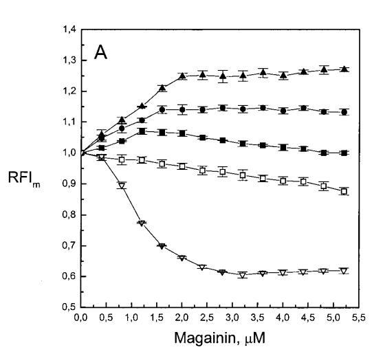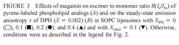 有趣的是,在存在酸性磷脂的情況下,肌動(dòng)蛋白/脂質(zhì)的摩爾比(在該摩爾比下,肌動(dòng)蛋白的初始增量趨于穩(wěn)定)分別為1:21、1:16和1:12.5,對應(yīng)于XPG=0.1、0.2和0.4(圖2A),分別產(chǎn)生1:2、1:3和1:5的肌動(dòng)蛋白/磷脂化學(xué)計(jì)量比。同時(shí),DPH的初始r增量在magainin/脂質(zhì)摩爾比為~1:30、1:12和1:5時(shí)趨于平穩(wěn)(XPG分別為0.1、0.2和0.4),對應(yīng)于大約1:3、1:2.5和1:2的magainin/PG化學(xué)計(jì)量比(圖3)。據(jù)報(bào)道,在這些肽/脂質(zhì)摩爾比下,magainin可插入含酸性磷脂的膜中(Ludtke等人,1994年)。此外,已經(jīng)證明,雙分子層中magainin的=-螺旋的方向取決于肽與脂質(zhì)的摩爾比,在上述化學(xué)計(jì)量比下,螺旋應(yīng)垂直于膜表面插入,在含PG的膜中形成孔(Ludtke等人,1996)。這些孔不僅由兩親螺旋的極性面組成,而且還由脂質(zhì)的極性頭基組成,內(nèi)外單層通過這些孔襯脂質(zhì)是連續(xù)的。膜中的這種結(jié)構(gòu)可能會(huì)降低探針芘部分微環(huán)境的極性,從而提高其量子產(chǎn)率。有趣的是,當(dāng)XPG>0.1時(shí),magainin 2逐漸降低Ie/Im值(圖3 A),這與增強(qiáng)的?;滍樞驕p少脂質(zhì)側(cè)向擴(kuò)散的速率一致。然而,由于magainin 2已經(jīng)在XPG=0.1時(shí)增加了r,Ie/Im沒有變化,我們可以得出結(jié)論,PPDPG探針向微區(qū)富集以及其橫向擴(kuò)散的減少正在發(fā)生。