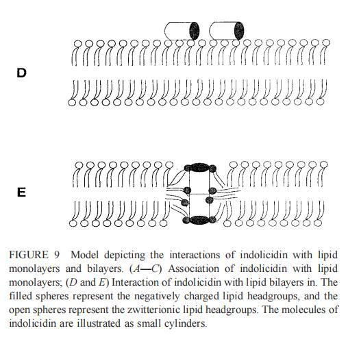 吲哚西丁只含有13個(gè)氨基酸,因此太短,無法跨越雙層。然而,該肽可以作為聚集物或帶有相關(guān)酸性磷脂的頭尾二聚體橫跨雙層(圖9 E),從而導(dǎo)致膜不穩(wěn)定性。已經(jīng)證明,吲哚西丁能夠通過穿過外膜殺死革蘭氏陰性細(xì)菌,并通過形成通道破壞細(xì)胞質(zhì)膜(Falla et al.,1996)。與magainin 2的作用相比,吲哚青霉素誘導(dǎo)的內(nèi)吞小泡較?。▓D7)可能反映了這些肽與脂質(zhì)相互作用的不同模式。一些吲哚肽分子可能會(huì)轉(zhuǎn)移到膜的內(nèi)部小葉中。除了具有廣譜的抗真菌和抗菌活性外,吲哚西丁對哺乳動(dòng)物細(xì)胞也有毒性(Schluesener等人,1993年;Ahmad等人,1995年)。有趣的是,吲哚西丁對SOPC和SOPC膽固醇巨型脂質(zhì)體的作用不同。在這一階段,根本原因尚不確定,可能與膽固醇對雙層結(jié)構(gòu)以及吲哚肽在膜中的取向的影響有關(guān)。因此,需要進(jìn)一步的研究來闡明膽固醇對吲哚肽膜結(jié)合的影響。