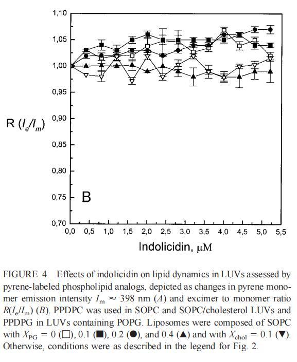 這兩種抗菌肽對芘標(biāo)記的磷脂類似物的猝滅機(jī)制令人感興趣??赡苌婕唉?陽離子相互作用(Dougherty,1996),后者由肽的堿性殘基表示。吲哚西丁具有較高的Trp含量(39%),可促進(jìn)其分配到脂質(zhì)雙層(Wimley和White,1996)。因此,芘和色氨酸之間的π-相互作用也是可能的。已經(jīng)證明,色氨酸可以淬滅膠束溶液中各種芘衍生物的熒光發(fā)射(Encinas和Lissi,1986;Altamirano等人,1998)。另一種可能性是鏈反轉(zhuǎn)(Holopainen et al.,1999),通過肽與脂質(zhì)雙層結(jié)合,導(dǎo)致芘部分調(diào)節(jié)到更極性的環(huán)境中,從而增加熒光團(tuán)微環(huán)境的極性,并導(dǎo)致量子產(chǎn)率降低。