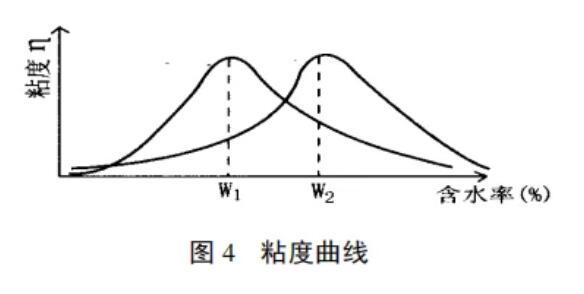 含水量高則流動性好(即每個顆粒表層水膜厚),但凝聚性差,坯體易變形。因此,對每一企業(yè)來講,在原料處理、擠泥機等條件固定的前提下,摸索一個合適的成型含水率,既利于擠泥機成型,又利于磚坯強度。根據(jù)我們對幾十種黏土的試驗數(shù)據(jù),每種黏土都有一個最佳含水率,在這種含水率的情況下,黏土的粘性(稠度)最好。典型的粘度曲線(見圖4):