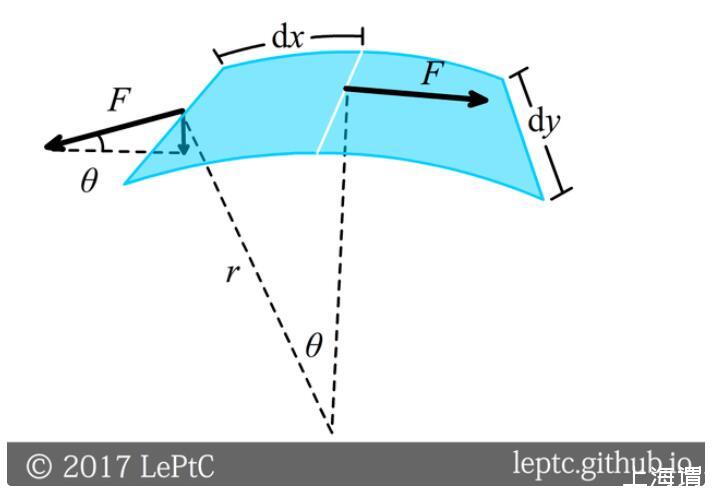 假設(shè)膜在x的方向彎曲,曲率半徑為r,作用在一個微小的長度dy上的表面張力F=σdy,sinθ≈dx/r,指向球內(nèi)的合力為Fsinθ=σdxdy/r(沒有乘2是因?yàn)槊織l邊的力被相鄰兩個面元共用),這一力由壓強(qiáng)差平衡,除以面積dxdy得壓強(qiáng)差為σ/r。對于球面x和y方向都彎,故球內(nèi)壓強(qiáng)比球外大2σ/r(對于肥皂泡因?yàn)橛袃蓪咏缑孢€要再乘2)。