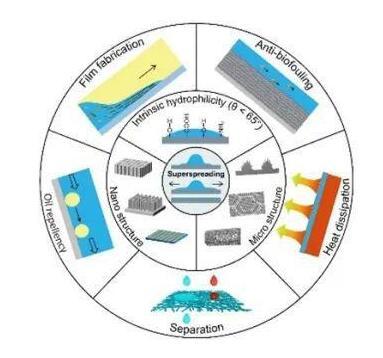 近日,中國科學(xué)院院士、中科院理化技術(shù)研究所研究員江雷和研究員田野團隊在Accounts of Chemical Research上,以Bioinspired superspreading surfaces:from essential mechanism to application為題,發(fā)表綜述論文,系統(tǒng)提出了超鋪展概念及其表征方法,綜述了超鋪展表面的本質(zhì)機理及研究進展,總結(jié)了超鋪展的應(yīng)用領(lǐng)域,展望了領(lǐng)域內(nèi)遺留的重大挑戰(zhàn)及發(fā)展方向。