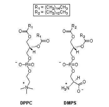 研究了兩性離子脂質(zhì)L-1,2-二棕櫚酰-sn-甘油-3-磷酸膽堿(DPPC)和帶負電脂質(zhì)L-1,2-二甲基-sn-甘油-3-磷酸絲氨酸(DMPS)的陽離子-脂質(zhì)相互作用。脂質(zhì)的結構如圖1所示。DMPS和DPPC單分子膜表現(xiàn)出非常相似的相行為,都顯示出不同的共存區(qū)域。28 DPPC和DMP都有飽和烷基鏈,烴鏈的長度略有不同。因此,這兩種不同類型的脂質(zhì)呈現(xiàn)出良好的模型系統(tǒng),其中陽離子-脂質(zhì)相互作用可以遵循不同的階段,并且可以揭示脂質(zhì)頭基電荷的影響。