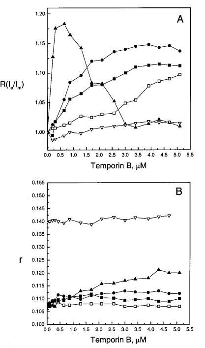 圖3:通過芘標(biāo)記的磷脂PPDPC(X)0.01)的熒光和DPH(X)0.002的穩(wěn)態(tài)發(fā)射各向異性r評估顳葉素B對LUV中脂質(zhì)動力學(xué)的影響,顯示為具有XPOPG)0(0)、0.10(9)、0.20(B)和0.40(2)的SOPC脂質(zhì)體中歸一化準(zhǔn)分子與單體比率r(Ie/Im)(圖A)和各向異性r(圖B)的變化,Xchol)0.10(3)。每個數(shù)據(jù)點(diǎn)代表三次測量的平均值。標(biāo)準(zhǔn)偏差小于0.02(面板A)和0.004(面板B),為清楚起見,未顯示。否則情況如圖2圖例所示。