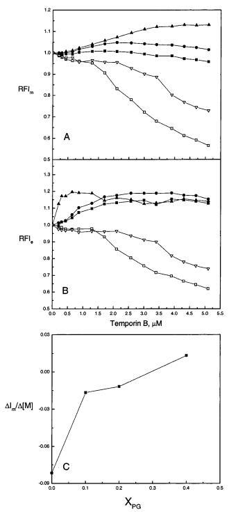顳蛋白對雙層脂質(zhì)動力學(xué)的影響。隨后通過記錄摻入LUVs的芘標(biāo)記熒光磷脂類似物PPDPC(X)0.01)的發(fā)射光譜來研究肽與脂質(zhì)體結(jié)合的后果。對于含有脂質(zhì)類似物(如PPDPC)的單個芘部分,穩(wěn)態(tài)Ie/Im值反映了膜中熒光團(tuán)的橫向遷移率和局部濃度(18,19)。然而,我們之前的研究比較了兩種其他抗菌肽(馬蓋寧2和吲哚肽)對膜脂質(zhì)動力學(xué)的影響,發(fā)現(xiàn)這些肽也影響芘標(biāo)記脂質(zhì)的量子產(chǎn)率(15)。對于SOPC LUV,添加temporin B分別導(dǎo)致芘單體和準(zhǔn)分子發(fā)射Im和Ie的顯著減少,最大減少約40%(圖2,面板a和B)。芘熒光帶的猝滅是雙相的,當(dāng)時間蛋白B與脂質(zhì)的摩爾比約為1:12時,量子產(chǎn)率顯著降低(圖2,面板a和B)。在膽固醇(Xchol)0.10)存在的情況下,temporin B對芘單體和準(zhǔn)分子熒光的猝滅也很明顯,盡管發(fā)射的減少量小于在SOPC LUV中觀察到的減少量(圖2,面板A和B)。然而,當(dāng)酸性磷脂POPG存在于XPOPG)0.10時,Im中只有微不足道的變化是明顯的,當(dāng)XPOPG從0.20增加到0.40時,時間蛋白B導(dǎo)致Im以漸進(jìn)的方式增加,Im的初始增量在大約2/1的POPG/時間蛋白B化學(xué)計(jì)量比下趨于穩(wěn)定。在達(dá)到飽和響應(yīng)之前,Im中線性增量的斜率隨著XPOPG而增加(圖2,面板C)。在POPG存在的情況下,顳蛋白B也增加了Ie。在XPOPG)0.40時,Ie的值逐漸增加,直到顳蛋白B:脂質(zhì)摩爾比為≈1:15,對應(yīng)于≈1/6,而當(dāng)超過該化學(xué)計(jì)量比時,Ie降低。圖3,面板A中顯示了由于顳蛋白B引起的Ie/Im的變化。具體而言,SOPC LUV的Ie/Im增加了1.1倍,而在膽固醇(Xchol)0.10的存在下,觀察到Ie/Im的微小變化,面板A)。將XPOPG從0.10增加到0.20會逐漸增強(qiáng)Ie/Im的增量。有趣的是,在XPOPG)0.40時,當(dāng)時間蛋白B:脂質(zhì)摩爾比為≈1:30.然而,在這一肽:脂比之上,顳葉素B導(dǎo)致Ie/Im降低,而在這一肽:脂比之上,Ie/Im的變化不顯著≈1:6.