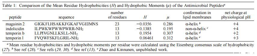 我們的長(zhǎng)期目標(biāo)是建立最低的序列要求,這可以進(jìn)一步作為設(shè)計(jì)新型抗菌肽類(lèi)似物的指導(dǎo)原則。我們之前已經(jīng)比較了兩種抗菌肽,馬蓋寧2和吲哚肽對(duì)本研究中使用的相同模型膜系統(tǒng)的影響,即。,單層、脂質(zhì)體和巨大囊泡(15)。我們?cè)缙谘芯恐惺褂玫碾氖沁x擇的,因?yàn)樗鼈兇韮煞N不同類(lèi)型的抗菌肽家族。在本研究中,我們使用了兩種13個(gè)氨基酸的肽,即與吲哚肽長(zhǎng)度相似的肽。肽的結(jié)構(gòu)參數(shù)不同,如電荷、構(gòu)象、疏水性、疏水力矩和大?。ū?)。有趣的是,在所研究的四種肽中,以摩爾為基礎(chǔ)計(jì)算的時(shí)間蛋白L最有效,作用于中性和酸性磷脂膜。與其他三種肽相比,其凈陽(yáng)離子電荷和疏水性具有平均值(表1)。然而,在所示的肽中,temporin L具有最高的平均疏水力矩,這表明這可能是與其有效的膜擾動(dòng)作用相關(guān)的一個(gè)重要參數(shù),這與之前比較magainin 2和其他抗菌肽的研究一致(31)。
