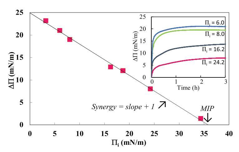 確定綁定參數(shù)的典型示例如圖2所示。實際上,對于6.0、8.0、16.2和24.2 mN/m的i,分別獲得了21.0、19.0、12.9和8.0 mN/m的(圖2插圖)。被繪制為i的函數(shù),導致負斜率。因此,在DPPE存在的情況下,mNCS1的MIP值為35.8±1.1 mN/m,協(xié)同值為0.30±0.02。這種積極的協(xié)同作用表明mNCS1和這種脂質單層之間發(fā)生了積極的相互作用。然后,以不同的i注射每種脂質和MIP,并根據(jù)表面壓力動力學計算協(xié)同值。