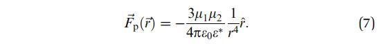 其中Ai表示域i的面積,dai表示其面積元素,-ri表示其相對于域中心的位置向量,i=1,2-r是從域1中心到域2中心的向量,如圖1所示。e0是真空介電常數(shù),ew和ea分別是水和空氣的相對介電常數(shù)。在這里,我們使用了Urbakh等人21的研究結(jié)果,該研究描述了由兩個(gè)半無限介質(zhì)包圍的薄電介質(zhì)層中偶極子之間的相互作用。