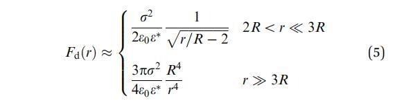 該力沿中心線分布,其大小僅取決于域之間的距離r。Fd(r)沒有解析表達(dá)式,因此必須進(jìn)行數(shù)值計(jì)算。然而,對于單分散系統(tǒng)的特殊情況(所有域半徑等于R),Wurlitzer等人22發(fā)現(xiàn)該力的漸近行為為: