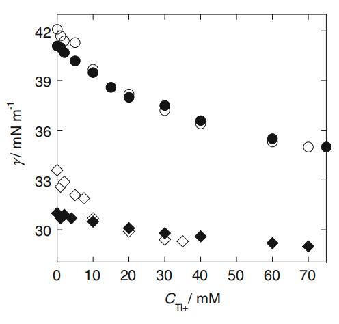 由于LAS的反陽離子?我們研究了鉈陽離子(Tl+)的加入對界面張力的影響。賤金屬的鉈作為單價陽離子存在于水溶液中,其離子化傾向在Na+和H+之間,因此它形成了比Na+更強的離子對,而且Tl+在界面上的吸附量也比Na+。添加Tl2SO4后,在pH 5.5和8.0下測量了SLA的界面張力(圖6),其中界面應首先被H+LAS覆蓋?和Na+LAS?,分別地已在cmc的兩側檢查了反陽離子的影響,即,對于pH 5.5,SLAS摩爾濃度保持恒定在2.5或3.5mM,對于pH 8.0,保持恒定在3.0或4.0mM。根據(jù)該圖,與pH 5.0相比,在pH 8.5添加Tl+時,界面張力顯著降低,并且它達到大約70mm的Tl+的幾乎恒定值,其中幾乎所有Na+必須在界面處被Tl+替換。由于pH值為5.5時反陽離子為H+,預計用Tl+取代H+會使界面張力增加,接近Tl+LAS的值?.然而,由于在pH 5.5時界面張力甚至降低,因此不能進行這種置換。在許多離子表面活性劑體系中觀察到,加入Tl2SO4后,離子強度增加可能會導致γ值的這種小幅度降低。因此,可以得出結論,LAS的界面張力?通過不同的反陽離子,其順序為Na+>Tl+>H+。在兩個pH值下,由于cmc也隨著離子強度的增加而降低,因此CScmc處的曲線圖。