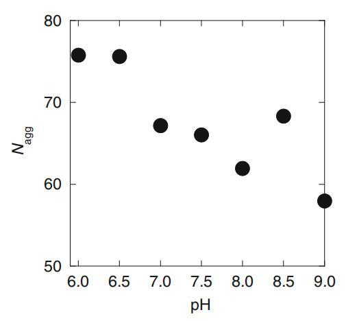 為了評估膠束(Nagg)的聚集數(shù),我們使用帶有猝滅劑(HPYL)的探針(Py)的穩(wěn)態(tài)熒光猝滅方法[8]。已發(fā)現(xiàn)該探針-猝滅劑對適用于評估幾種膠束系統(tǒng)的Nagg[14,15]。Cs=25 mM時的評估Nagg值如圖7所示。如圖所示,Nagg數(shù)值總體上隨著pH值的增加而降低。然而,似乎在pH 6.5-7附近也存在一個斷裂點。如果是這樣,膠束中HLA的pKa預計在6.5到7.0之間,這也比水溶液中的pKa大,就像空氣-水界面的結果一樣。為了進行進一步討論,我們需要更精確地確定這些Nagg值。
