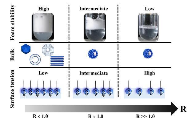 圖6.說明摩爾比(R)、泡沫穩(wěn)定性、本體自組裝和表面性質之間聯(lián)系的示意圖。