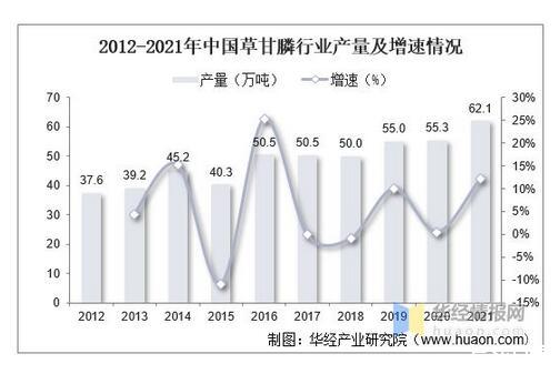2012-2021年中國草甘膦行業(yè)產(chǎn)量及增速情況