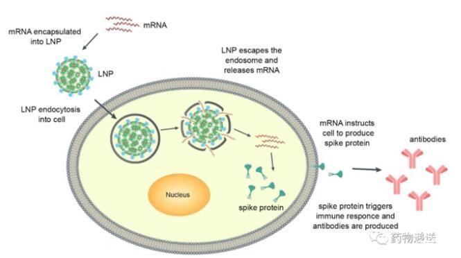 脂質(zhì)納米粒最新的成功案例是作為遞送載體用Pfizer/BioNTech和Moderna獲FDA批準的兩種COVID-19信使RNA(mRNA)新冠疫苗,這兩款疫苗以無與倫比的速度開發(fā)上市,并在流行病毒預(yù)防方面有著顯著的效果。疫苗將編碼SARS-CoV-2刺突蛋白的mRNA遞送到宿主細胞的細胞質(zhì)中,被翻譯成刺突蛋白充當(dāng)抗原,對病毒產(chǎn)生免疫反應(yīng)。