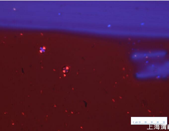 紅色的部分為墨水殘余物的涂片,藍紫色是載玻片本身在偏光鏡下的顏色。圖中可以看到兩個標準的馬耳他十字,基本上能夠驗證“sheen是結(jié)晶導致”這一說法