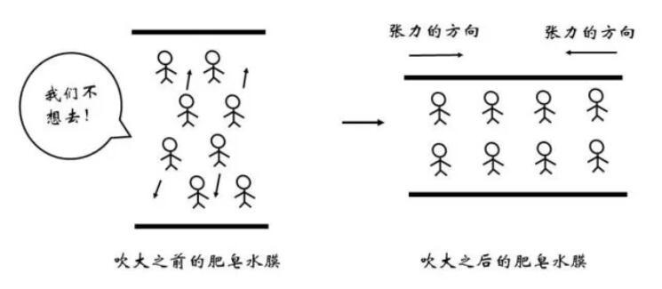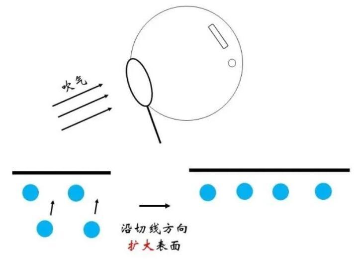 俗話說“物以類聚,人以群分”,更加相似的同類分子間往往關(guān)系更為融洽,而不同種分子間的關(guān)系則相對疏遠(yuǎn)。在物理上表現(xiàn)為同類分子間的勢能曲線最低點(diǎn)更低。因此,對于一個存在于內(nèi)部的水分子,如果來到表面,需要斷開與同類分子的部分關(guān)系,而代之以與比較“生疏”的空氣分子間的作用,顯然是不情愿的!這體現(xiàn)為能量的升高。那么,什么情況下水分子要從內(nèi)部來到表面呢?正是吹泡泡的時候。