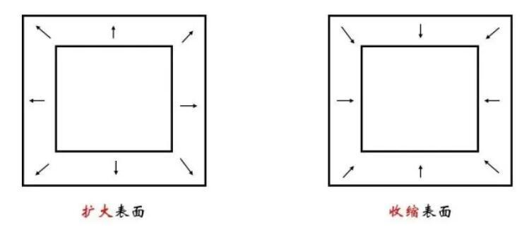 那么表面張力的方向是什么呢?我們同樣類比重力、彈力等力。簡單回顧不難發(fā)現(xiàn),如果將表面張力理解為單位面積形變引起的能量升高,那么對應(yīng)的力應(yīng)該指向使得能量降低的方向。對于表面張力,自然就是沿切線使得表面收縮的方向。