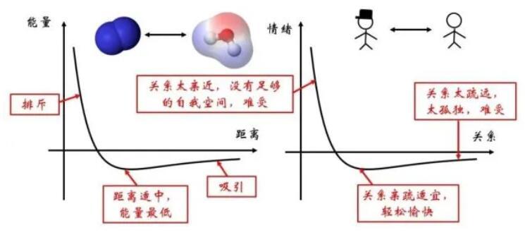 在微觀世界存在著多種多樣的分子,比如上圖所示的氮?dú)馀c水分子。分子間組成的體系的勢能與分子間的距離有關(guān)。這種關(guān)系正如兩個人之間的關(guān)系,遠(yuǎn)了近了都不好。如果距離太近,彼此之間沒了自我空間,情緒會不穩(wěn)定,因此會產(chǎn)生相互排斥的作用;如果距離太遠(yuǎn),每個人都太孤獨(dú),便會相互思念,彼此吸引。當(dāng)彼此的距離恰到好處,便對應(yīng)著能量的最低點(diǎn),較為穩(wěn)定。