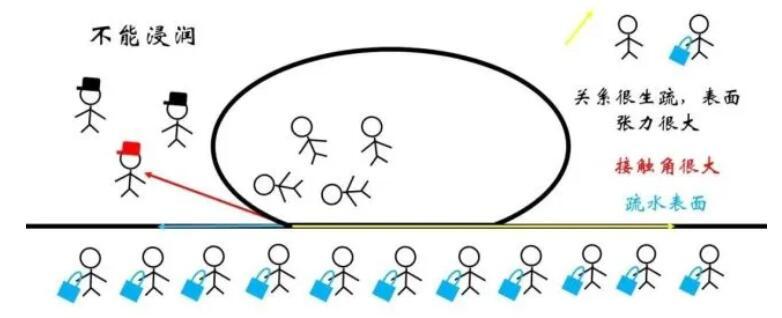 對于浸潤的情況,液體與固體物質(zhì)間的關(guān)系很好,最為極端地可以認(rèn)為該界面處的表面張力小到可以忽略。這樣一來,需要紅色和藍(lán)色的力的水平分量達(dá)到平衡,液滴的形狀趨于扁平。一般將氣液界面處張力與液固界面的夾角稱為接觸角,對于浸潤現(xiàn)象顯著的親水表面接觸角很小。