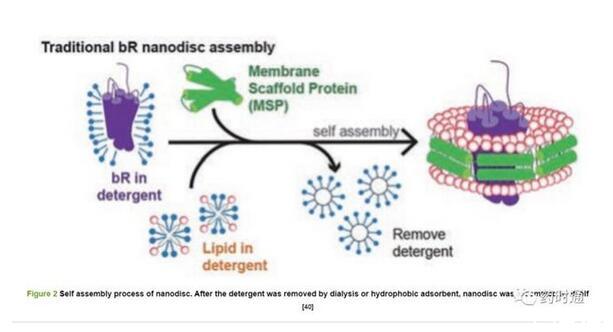 納米盤由磷脂和兩親性螺旋蛋白,也稱膜支架蛋白(membrane scaffold protein,MSP)組成。一般由130~160個磷脂形成含MPs的雙分子層,然后由MSP作為與MPs結合的疏水基團保持其天然構象[38]。單個MPs可形成150 kDa大小的納米盤。組裝納米盤時,首先將MSP按照一定比例與預先溶解在洗滌劑(通常是膽酸鈉)中的磷脂混合,孵育一段時間后利用透析或疏水吸附劑去除洗滌劑,隨后納米盤自行組裝形成納米級別類膜結構圓盤[39]。組裝包含MPs的納米盤只需在體系中再加入適量MPs,其自組裝過程與空納米盤相似。包含MPs的納米盤與空納米盤通過生化手段進行分離,隨后用分子排阻色譜進一步純化,過程如圖2所示[40]。