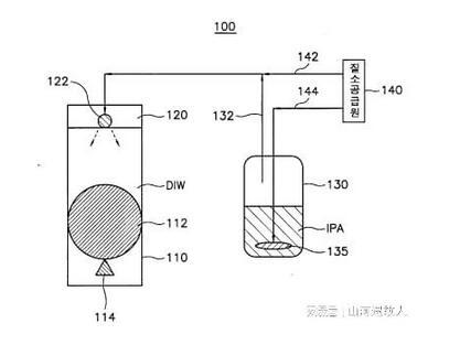 為了提高半導(dǎo)體元件的質(zhì)量,必須通過(guò)清洗工藝,由于上述脫離子水具有溶解硅的性質(zhì),必須完全干燥晶片,以避免在清洗工藝后形成脫離子水中的水斑(WATER SPOT)。為了提高對(duì)上述晶片的干燥效率,近年來(lái)采用了利用馬蘭戈尼效應(yīng)(MARANGONI)EFFECT)的干燥方法,馬蘭戈尼干燥方法是在一個(gè)液區(qū)存在兩個(gè)不同表面張力區(qū)的情況下,利用液從表面張力小的區(qū)域向表面張力大的區(qū)域流動(dòng)的原理對(duì)晶片進(jìn)行干燥。