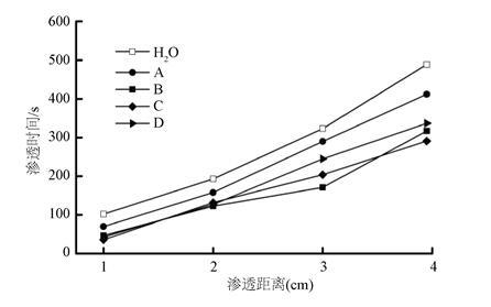 將抑塵劑A、B、C、D分別配制成0.2 wt.%的水溶液,在煤粉NR表面進(jìn)行正向滲透試驗(yàn),研究不同抑塵劑滲透煤塵距離1 cm、2 cm、3 cm、4 cm的潤濕能力。