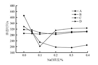 從圖4可知,NaCl對于提高抑塵劑潤濕性能的作用更為顯著。因此,在抑塵劑中加入不同濃度的NaCl,研究無機(jī)鹽濃度對煤塵NR的潤濕性能的影響。如圖5所示,少量的NaCl的引入,能夠降低抑塵劑在煤塵表面的滲透時(shí)間。NaCl的引入能夠降低抑塵劑溶液的表面張力,使抑塵劑在煤塵表面的接觸角不斷降低[18]。另外,無機(jī)鹽能夠增強(qiáng)表面活性物質(zhì)在煤塵表面的吸附能力,降低煤塵與抑塵劑之間的界面能,提高了抑塵劑對煤塵的潤濕性能;煤塵中含有大量的酚羥基、羧基等有機(jī)基團(tuán),因此煤塵表面呈現(xiàn)電負(fù)性[19]。當(dāng)NaCl含量持續(xù)增加時(shí),抑塵劑A、B、C在煤塵表面的滲透時(shí)間趨于平穩(wěn),而抑塵劑D出現(xiàn)滲透時(shí)間增加后平緩的趨勢。相比之下,抑塵劑B、C對于NaCl的敏感程度較低,隨著NaCl含量增加其潤濕能力變化不大;NaCl對抑塵劑A、D在煤塵表面的潤濕能力影響程度較大。