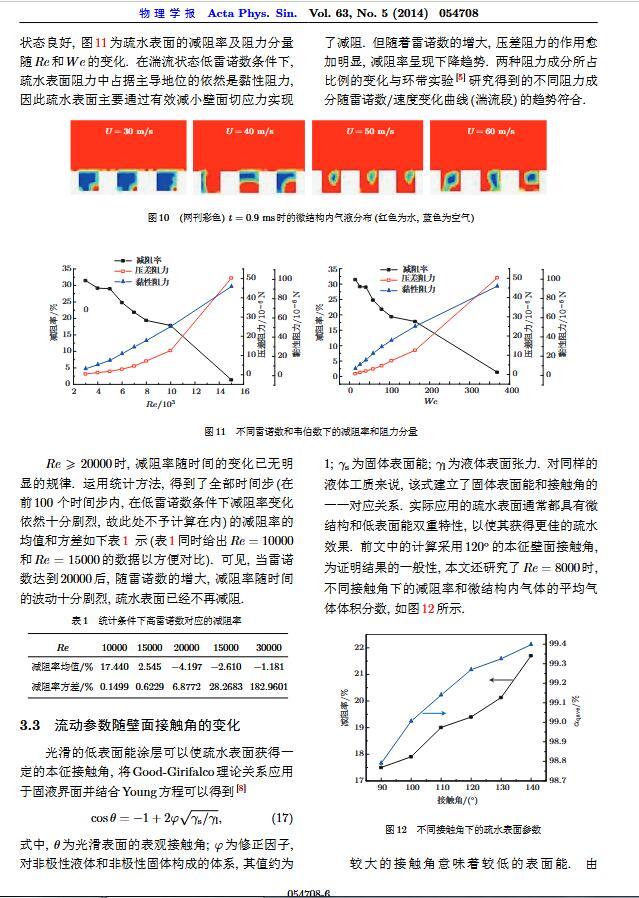 通過(guò)構(gòu)造具有棋盤(pán)狀微結(jié)構(gòu)的疏水表面,考慮表面張力的影響,利用定常與非定常結(jié)合的數(shù)值模擬方法,研究了疏水表面在湍流狀態(tài)下的減阻特性以及微結(jié)構(gòu)內(nèi)氣體封存的效果,其中Re=3000—30000.在低雷諾數(shù)下,疏水表面微結(jié)構(gòu)內(nèi)氣體封存狀態(tài)良好,減阻率最高約為30%;隨著雷諾數(shù)的增大,壓差阻力增大,減阻率有下降趨勢(shì).當(dāng)來(lái)流速度過(guò)大時(shí),水會(huì)大量進(jìn)入微結(jié)構(gòu),疏水表面的減阻率變化劇烈,且已經(jīng)不再減阻.結(jié)果表明,表面張力削弱了壁面切應(yīng)力的影響,使得低雷諾數(shù)下微結(jié)構(gòu)內(nèi)氣體能夠有效封存,進(jìn)而減小壁面阻力.