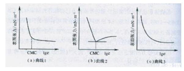測(cè)量原理:溶液的表面張力主要取決于溶液中表面活性劑單體的濃度。當(dāng)有膠束形成后,單體的濃度幾乎不變,所以表面張力對(duì)濃度作圖會(huì)出現(xiàn)明顯的轉(zhuǎn)折。一般都是濃度取對(duì)數(shù)坐標(biāo),所得曲線成為γ-logγ曲線,曲線上的拐點(diǎn)即可求出CMC,如果拐點(diǎn)不明顯,可將拐點(diǎn)兩邊的直線部分延長(zhǎng),由交點(diǎn)求出CMC。(圖3)表面活性劑水溶液的表面張力在濃度很低的時(shí)候隨著濃度的增加而急劇下降,到達(dá)一定濃度后(CMC)后變化緩慢或不再改變。