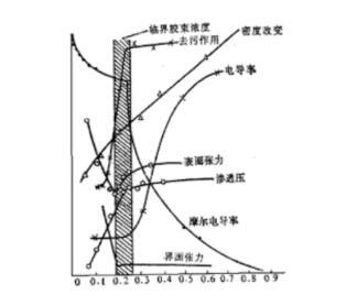 臨界膠束濃度的英文表達(dá)為:Critical Micelle Concentration,可縮寫(xiě)為CMC。自從Mcbain于1925年首次提出膠束(團(tuán))的概念,認(rèn)為當(dāng)濃度升至一定值時(shí),肥皂分子在水溶液中從單體締合為“膠態(tài)聚集態(tài)”,并稱(chēng)之為“膠束”或“膠團(tuán)”(圖1)。所形成的這些膠束是熱力學(xué)穩(wěn)定的,從而將形成膠束時(shí)的濃度稱(chēng)為臨界膠束濃度,簡(jiǎn)稱(chēng)為CMC。含有表面活性劑溶液體相中一旦形成了膠束或膠團(tuán)后,溶液體相的一系列性質(zhì)會(huì)發(fā)生改變(圖2),例如摩爾電導(dǎo)率、表(界)面張力、去污力、滲透壓以及增溶、吸附量等突變是因?yàn)槿芤后w相中出現(xiàn)了表面活性劑聚集態(tài),這些性質(zhì)的變異通常都發(fā)生于一個(gè)窄濃度范圍,而將這個(gè)窄濃度范圍定義為臨界膠束濃度,獲取的方法就是將CMC兩側(cè)溶液性質(zhì)連續(xù)變化的曲線延長(zhǎng)至相交,交點(diǎn)所對(duì)應(yīng)的濃度為CMC。