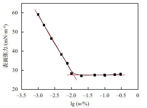 選擇陰離子-非離子表面活性劑復(fù)配體系,以十二烷基硫酸鈉(SDS)和烷基糖苷(APG)復(fù)配組分作為實驗對象,質(zhì)量比為1:1。實驗結(jié)果見表2。試樣的表面張力曲線圖如圖2所示。