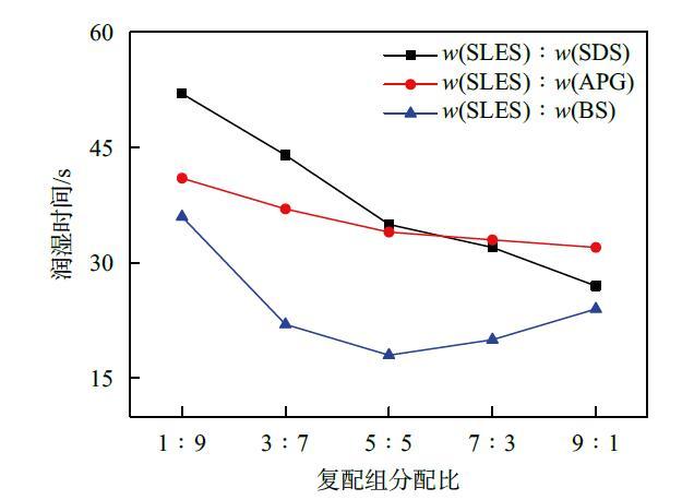 實驗測得SLES,SDS,APG和BS在w=0.2%時的潤濕時間依次為26,102,39和42 s。由圖5可知,SLES與SDS、APG復(fù)配時,潤濕性能未表現(xiàn)出明顯的增效作用,潤濕時間的降低可歸因于SLES的潤濕能力更好,因此隨著SLES組分的增加,復(fù)配溶液的潤濕時間降低。SLES與BS復(fù)配時,潤濕能力表現(xiàn)出明顯的增效作用,當(dāng)質(zhì)量分數(shù)比為5:5時,潤濕時間為18 s,低于兩種單一物質(zhì)的潤濕時間。