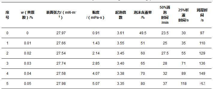 由表3可知,隨著黏度的增加,起泡倍數(shù)呈現(xiàn)下降趨勢,當(dāng)黏度為0.91 mPa·s時,起泡倍數(shù)為3.61,當(dāng)黏度為5.07 mPa·s時,起泡倍數(shù)為3.35。導(dǎo)致起泡倍數(shù)降低的原因可能與流動性和表面張力等因素有關(guān),隨著溶液黏度的增加,溶液的流動性降低,表面活性劑向氣液界面遷移的能力減弱;由實驗結(jié)果可知,黃原膠的加入對表面張力無明顯影響,表明黃原膠屬于非表面活性物質(zhì),它的加入增加了液體的流阻但沒有增加液體流動的推動力(即降低表面張力),因此溶液的起泡能力下降。