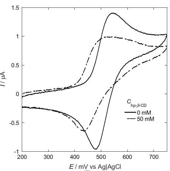 在這里,我們選擇 I2/I? 作為電化學探針,因為 I? 的電荷有望使其與陽離子膠束的結(jié)合變得容易,并且電中性 I2 有望在膠束中表面活性劑的疏水部分之間增溶并溶解在電極表面的表面活性劑單層中。 我們研究了 hp-β-CD 對 I2/I- 氧化還原峰的影響(圖 5)。 在沒有 hp-β-CD 的情況下,觀察到 I- 在約 530 mV 處的陽極峰和 I2 在約 480 mV 處的陰極峰。 在 50 mM hp-β-CD 存在下,陽極和陰極峰值電流均降低,并且它們的峰值電位向負方向移動。 陽極峰值電流的降低是由 I? 與 hp-β-CD 的親水表面結(jié)合引起的。 另一方面,陰極峰值電流的降低是由 hp-β-CD 疏水腔中包含 I2 引起的 [18]。 峰值電位的負移表明結(jié)合在 hp-β-CD 腔中的 I2 比結(jié)合到 hp-β-CD 表面的 I- 更穩(wěn)定。
